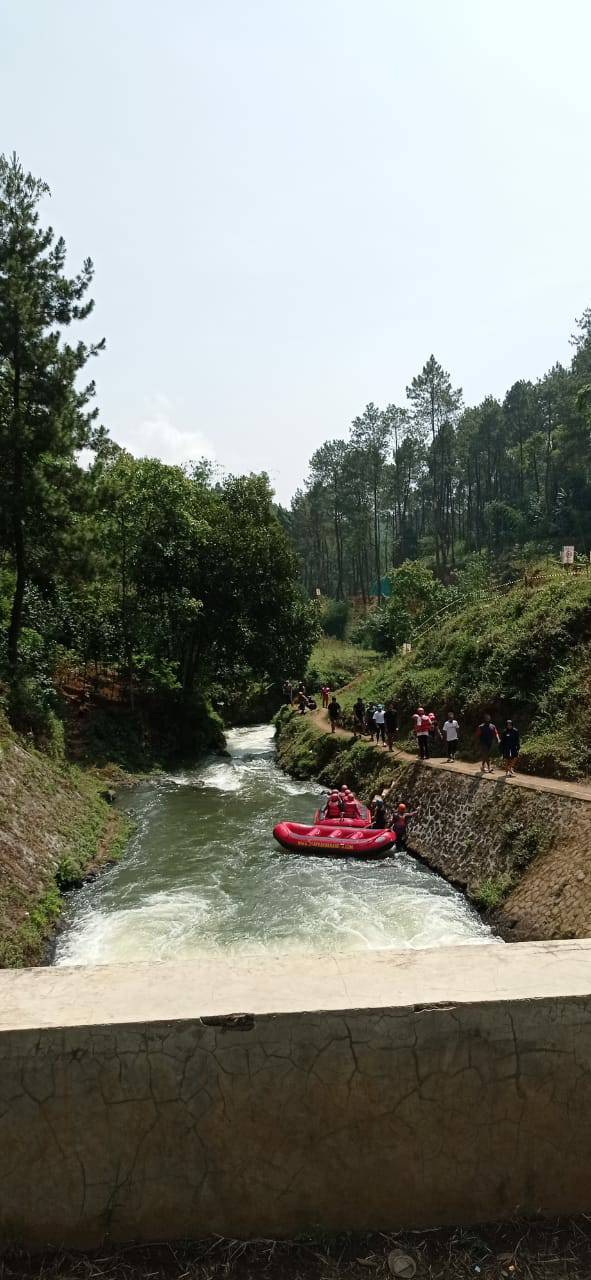 Pada saat di jalur sungai kami bertemu dengan beberapa kelompok lain dengan rompi pelampung yang berbeda warna dan disana kami melakukan yel-yel “Tim biru Go Go Go” membuat kita menjadi semangat dan kelompok lain melakukan balasan yel-yel sehingga pada saat di jalur sungai menjadi asik dan ceria. Selama 30 menit petualangan di jalur sungai kita terus di gempur dengan beberapa air terjun dan bebatuan yang besar serta kecil dan baju kami basah kuyup karena keseringan melewati air terjun dan masuk ke perahu, oiya ketika kita melewati air terjun instruktur akan meneriaki dengan keras BOOM!! lalu kita harus melakukan posisi turun dan jongkok kebawah pijakan perahu supaya tidak terpental ke depan atau samping, dan apabila tersangkut perahunya instruktur akan menerikai KIRI!! apabila akan berbelok kekiri dan kita menarik tali barengan ke kiri dan apabila ke kanan instruktur akan meneriaki KANAN!! lalu kami menarik tali ke posisi kanan, instruksi itu supaya mempermudah ketika perahu tersangkut ke bebatuan atau pohon dan tidak menyulitkan instruktur yaaa begitulah kita selaku dalam satu team harus bekerjasama dalam kondisi suka maupun duka.