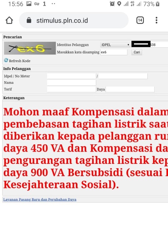 Keterangan ” Mohon maaf kompensasi dalam bentuk pembebasan tagihan listrik saat ini hanya diberikan kepada pelanggan rumah tangga daya 450 VA dan kompensasi dalam bentuk pengurangan tagihan listrik kepada pelanggan daya 900 VA Bersubsidi (sesuai data terpadu kesejahteraan sosial).